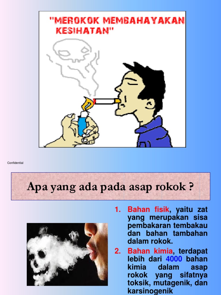 Ada lebih dari 4.000 bahan kimia ditemukan dalam rokok dan 69 diantaranya dapat menyebabkan resiko kanker.