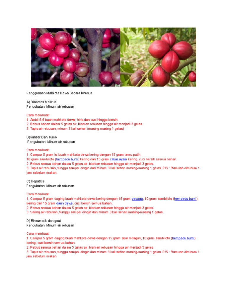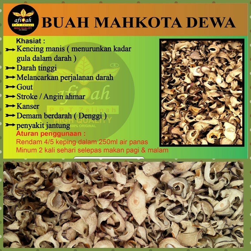 Disinilah muncul pribahasa bagaikan buah simalakama. Umumnya, manfaat buah mahkota dewa ini dapat anda dapatkan dengan cara meminum air rebusannya, buah kering hingga ekstrak dalam kapsul. Buah mahkota dewa tidak umum dikonsumsi, tapi sering digunakan sebagai herbal. Namun tanaman ini kini sudah. Minum ramuan yang telah dingin 1 jam sebelum makan.