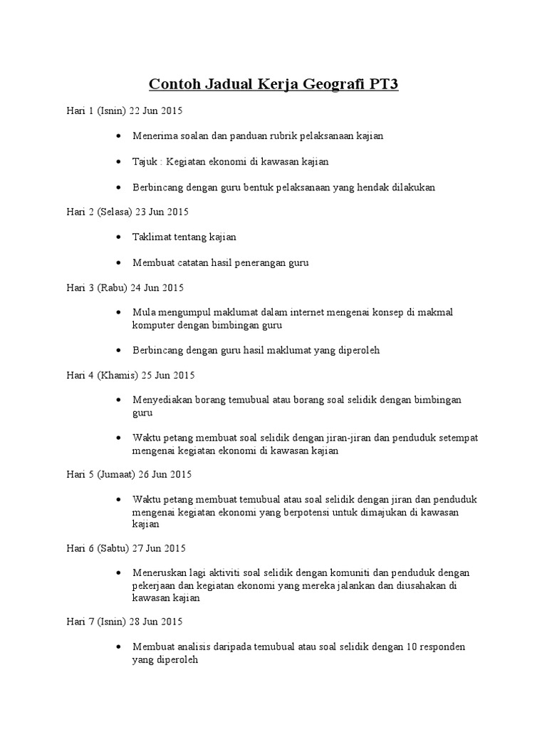 Perancangan kerja adalah satu aktiviti penulisan aspek pengenalan yang bersesuaian dengan tugasan. Contoh jadual kerja geografi pt3 2018 senarai semak tugasan. Contoh jadual kerja kajian lapangan geografi. Menurut lembaga peperiksaan kpm, calon pt3 perlu menyiapkan kerja kursus geografi pt3 2018 secara individu mulai 8 hingga 27 julai 2018. Contoh jadual kerja kajian contoh urun cute766.