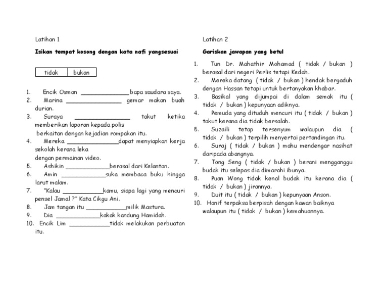 L a t i h a n 1. Terdapat dua kata nafi, iaitu bukan dan tidak. Kenyataan itu tidak benar rumah itu tidak besar sangat. Saya bukan murid tahun lima. Ya, saya murid tahun 5 cerdas. Pesalah itu _____ membuat sebarang pengakuan ketika dihadapkan ke mahkamah. Latihan kata nafi by nurulsanid88. Benar, dialah yang melukis lukisan itu. A) ini bukan baju saya. Latihan kata nafi dan kata pembenar latihan pdpr m2 id: Video ini berkaitan dengan kata nafi dan kata pembenar bagi subjek bahasa melayu tahun 5. 2 a betul, matahari memancarkan cahaya. 2 tatabahasa kata pemeri c.